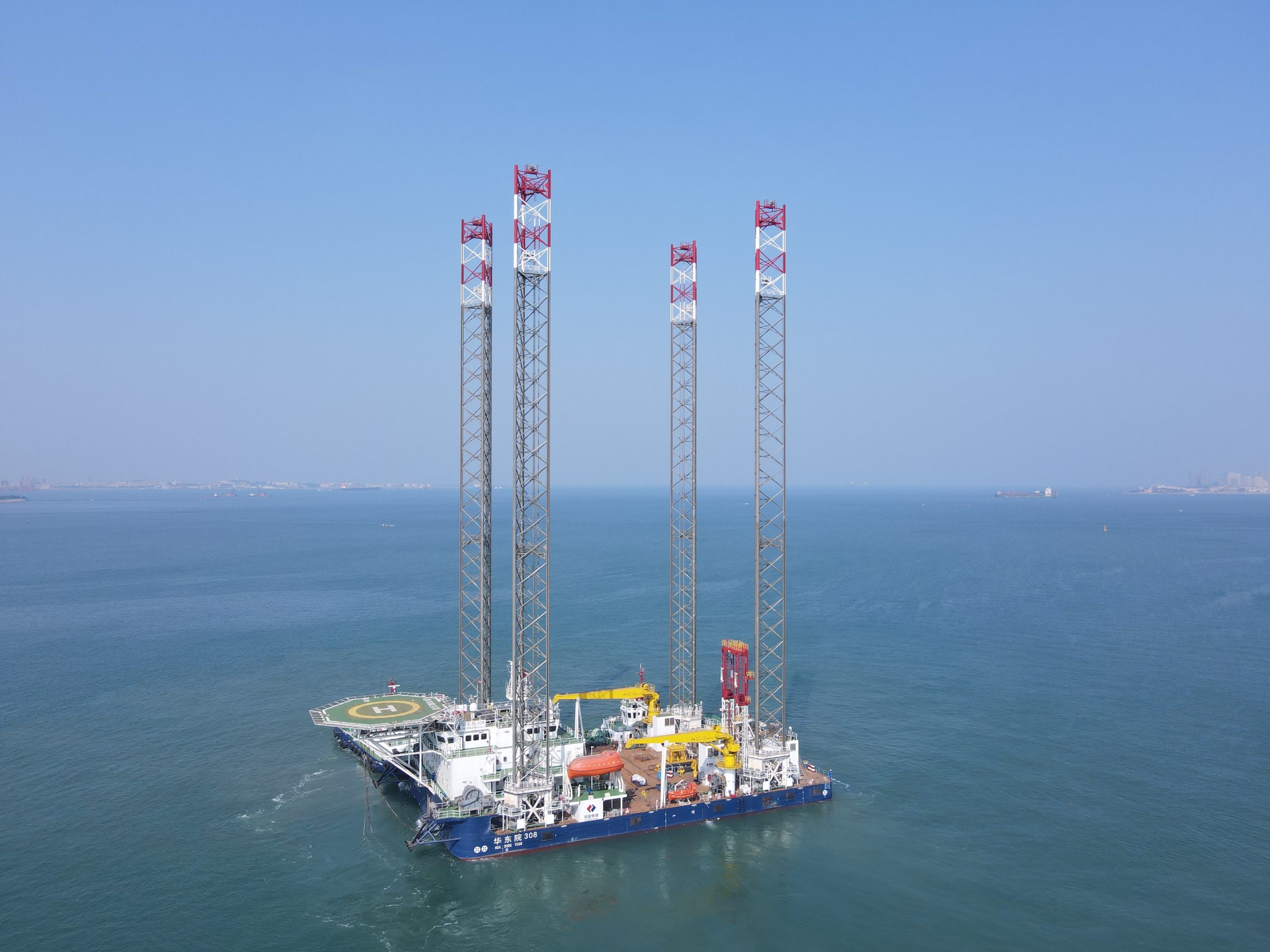 “華東院308”平臺是當前我國性能最先進、作業水深最大、升降速度最快、搭載裝備最全面、核心部件國產化最高的勘測試驗平臺。平臺為鋼質、船型、桁架樁腿自升式平臺,全長79.68米,寬34.8米,工作甲板面積超過2000平方米,可滿足60人連續20天海上作業的需求。平臺常規作業水深75米,極限作業水深為80米,在極端惡劣風暴狀況時,最大可抗風100節,作業區域可覆蓋我國規劃各海域風電場。